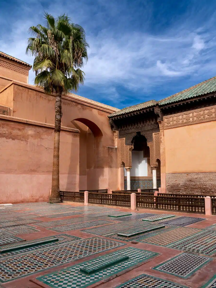 After exploring the ruins of El Badi Palace, take about a seven-minute walk to the Saadien’s Tombs. Surrounded by gardens and boasting colourful mosaic tiles, arched doorways, chandeliers, and marble, Saadien’s Tombs are an ancient royal necropolis in Marrakech.
